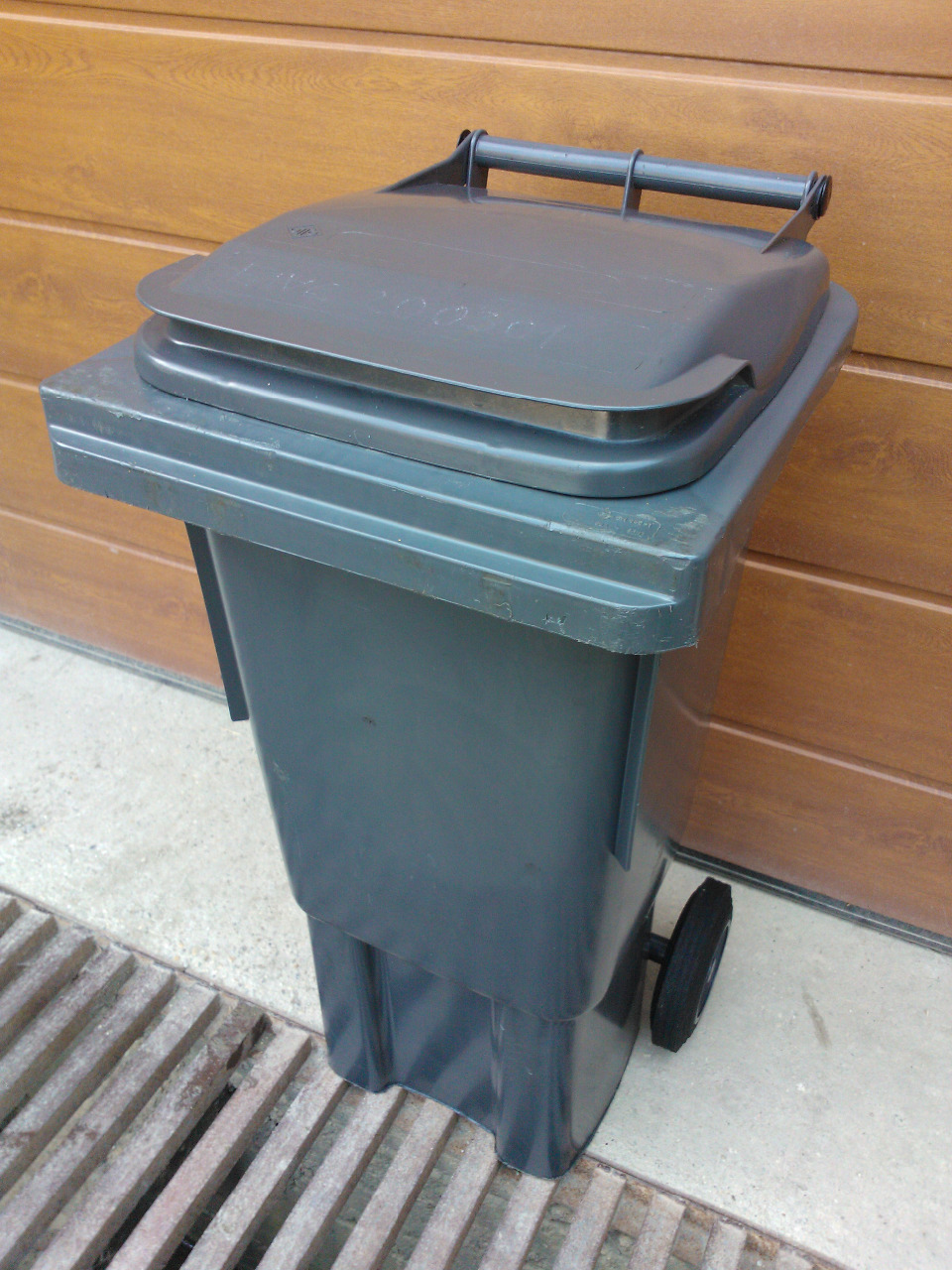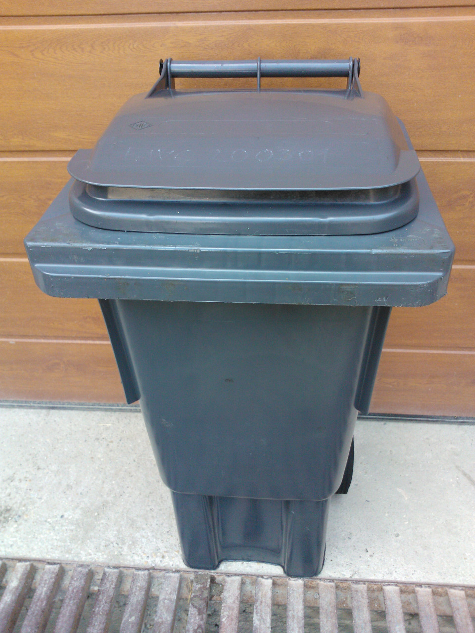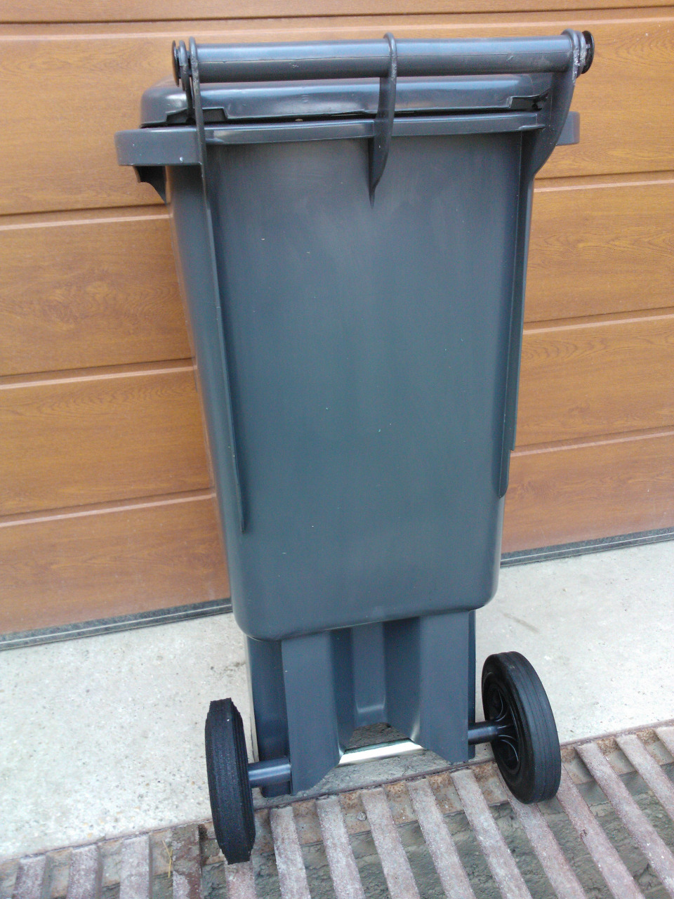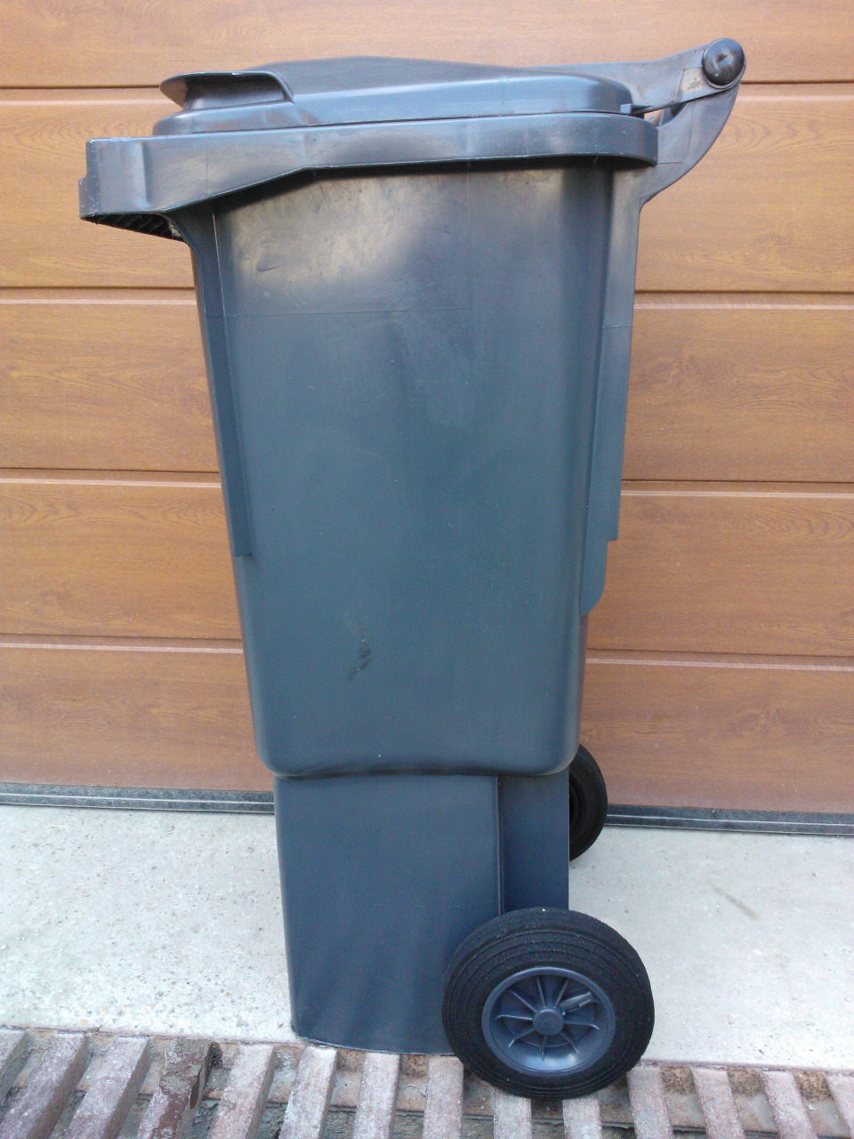 Csapófedeles, szürke, kerekes edény.